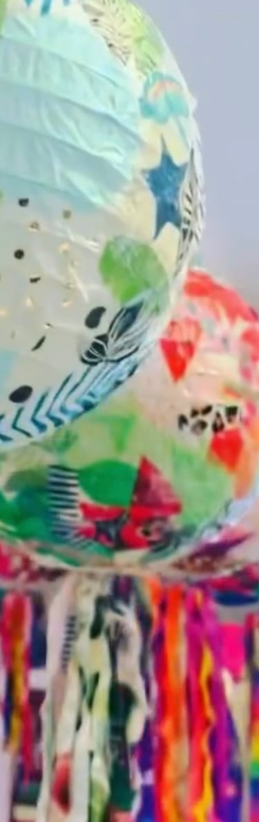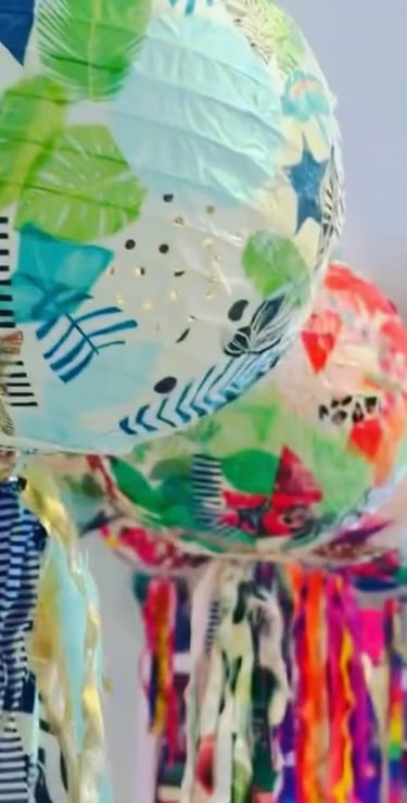 - création d'une lampe chinoise à l'aide de rubans et de jolis motifs colorés à appliquer au pinceau et à la colle