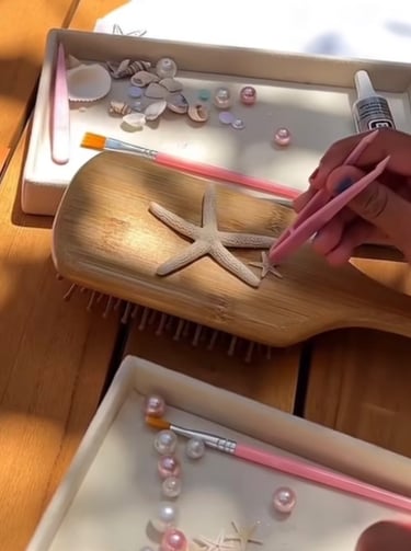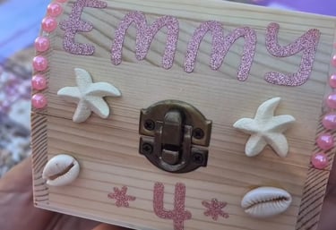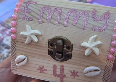 Lors de cet atelier, chaque invitée va pouvoir personnaliser sa boite à trésor/ à bijoux et une jolie brosse à cheveux en bois avec des perles, des coquillages et des strass.