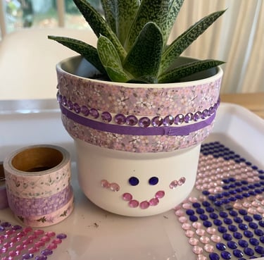 Ensuite, ils vont décorer chacun un pot de fleur à l'aide de Stickers, tape et strass. Ils pourront ensuite y planter une jolie fleur, cactus ou un bulbe en fonction de la saison.
