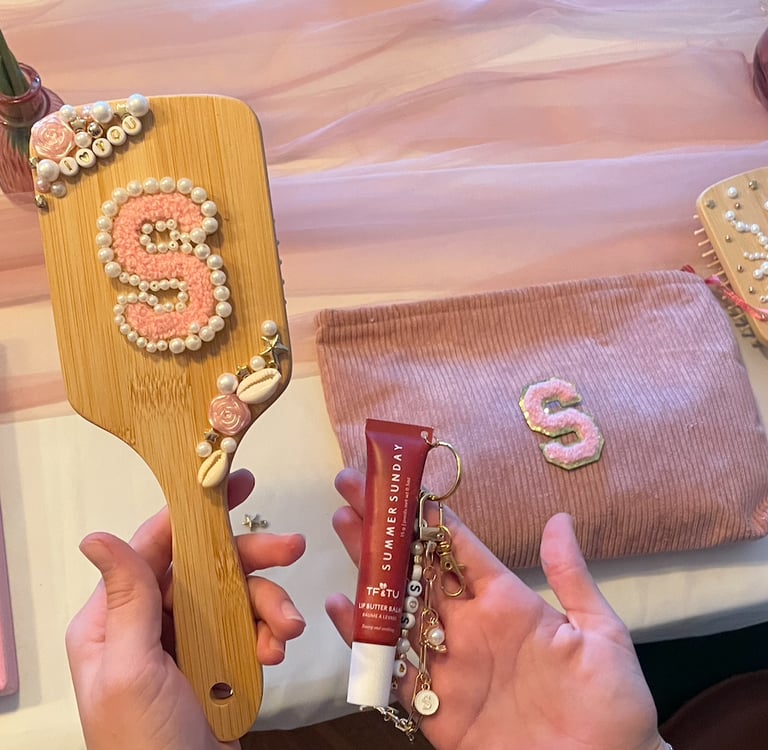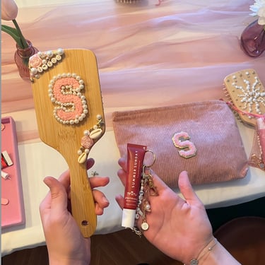 Lors de cet atelier, chaque invitée va pouvoir personnaliser une jolie trousse de toilette ou un tote bag* avec la 1ere lettre de leur prénom.