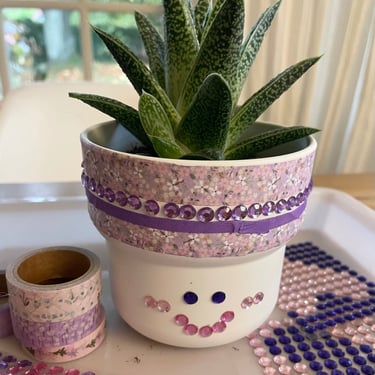 Ensuite, ils vont décorer chacun un pot de fleur à l'aide d'autocollants, de washi tape et de strass en tout genre. Ils pourront ensuite y planter une jolie fleur, un cactus ou un bulbe en fonction de la saison.