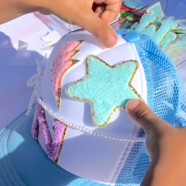 Les invités pourront décorer leur accessoire et le personnaliser avec une variété d'écussons amusants et de motifs originaux aux formes colorées.