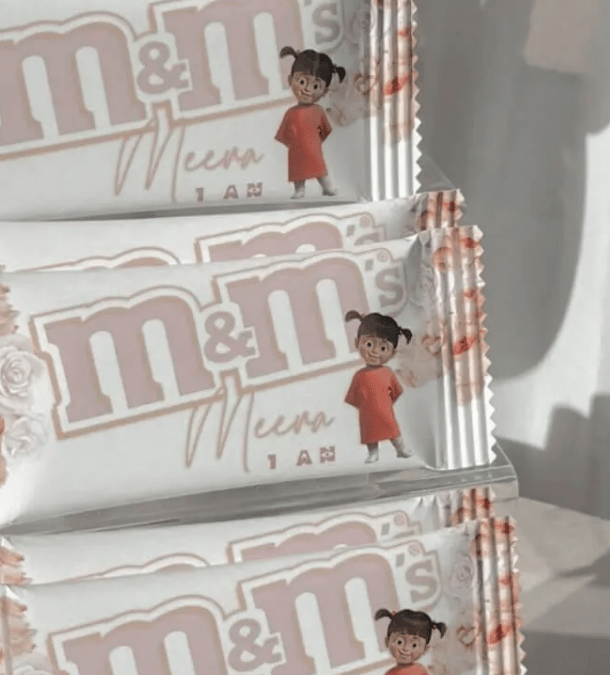 Paquets de M&M's, de chips, de Kinder Bueno, bouteille pour faire des bulles, bouteilles d'eau ou d'autres douceurs peuvent être personnalisés au prénom de l'enfant et au thème de la fête.